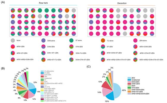 团队从全国药材市场系统收集了50批薏苡仁随机样本进行深入分析。结果发现,霉菌毒素污染普遍存在,其中玉米赤霉烯酮(ZEN)污染最为突出。更值得警惕的是,近四分之三的污染样品存在两种及以上霉菌毒素的共污染现象,这可能带来协同增强的健康风险。