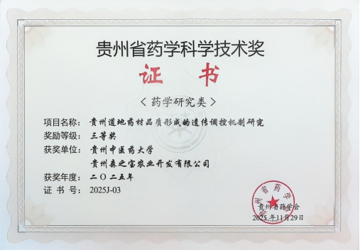 2025年11月29日,贵州省药学科学技术奖颁奖典礼于贵阳贵山和泰酒店隆重召开。本次评奖共颁发10项获奖成果,其中药学研究类一等奖1项、二等奖3项、三等奖5项;医院药学类二等奖1项。由我院徐娇、周涛、王艳红、欧小宏、何华等合作完成的“贵州道地药材品质形成的遗传调控机制研究”项目,获得药学研究类三等奖。